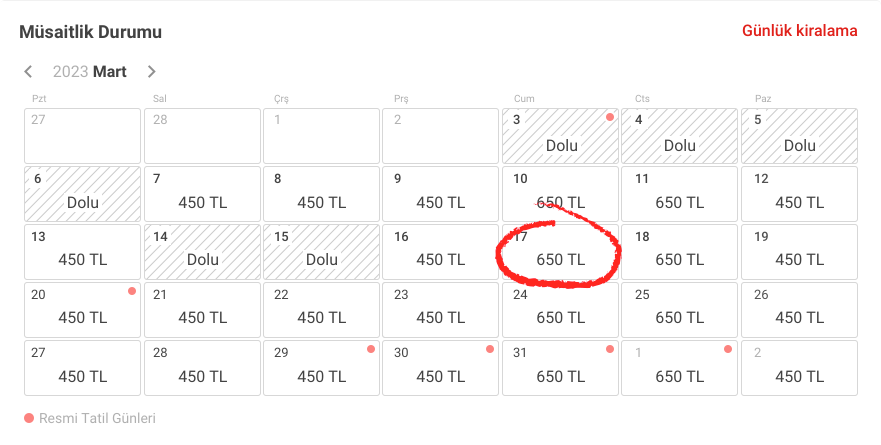2. Takvim özelliği ile ilanınızın uygunluğunu ve günlük fiyatını kolaylıkla işaretleyebilirsiniz. Üstelik bunu yaparken sene içerisindeki tüm resmi tatil günlerini de takvim üzerinde kolayca görebilirsiniz. İlanınızı ister günlük, isterseniz aylık olarak listeleyebilir, esnek şekilde takvim üzerinden fiyatlama yapabilirsiniz.